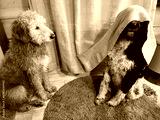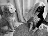 Two dogs sitting, one playing hide and seek behind a curtain