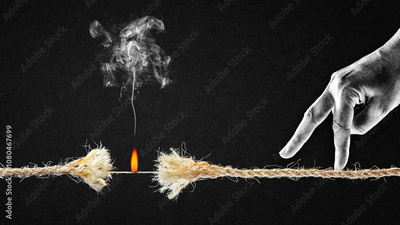 Fingers Walking Over Burning Frayed Rope About to Break in Black and White on Textured Paper Background Banner, Copy Space