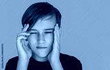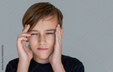 Little boy having a headache, pain. Headache child. Suffering migraine. Headache because stress. Portrait of a sad boy holding his head with his hand, isolated on the gray background