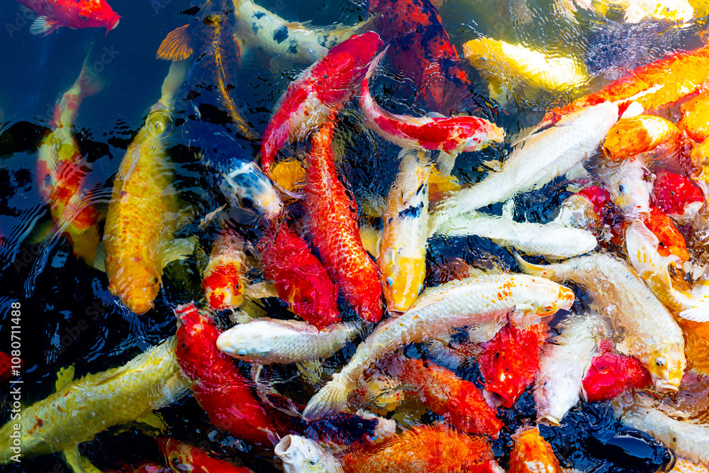 Many koi fish in the pond,Many Koi fishes or colorful fancy carps swimming in a pond and finding food. A bustling view of Japanese koi as they swim together and to be feed in a pond.