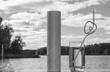 water filter, glass of water with a heart-shaped cocktail straw on a nature background