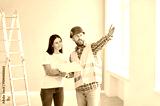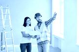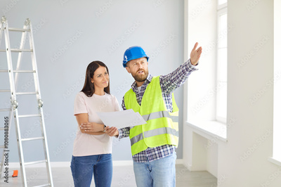 Skilled professional repairman explaining, architect construction worker with talking to client considering flat plan documents, planning collaborative building project, choosing paint, designing