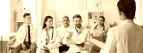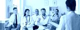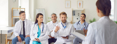 Group of professional doctors sitting on meeting discussing patient diagnosis and treatment in clinic. Medical staff listening a colleague with report in conference room. Healthcare concept. Banner.