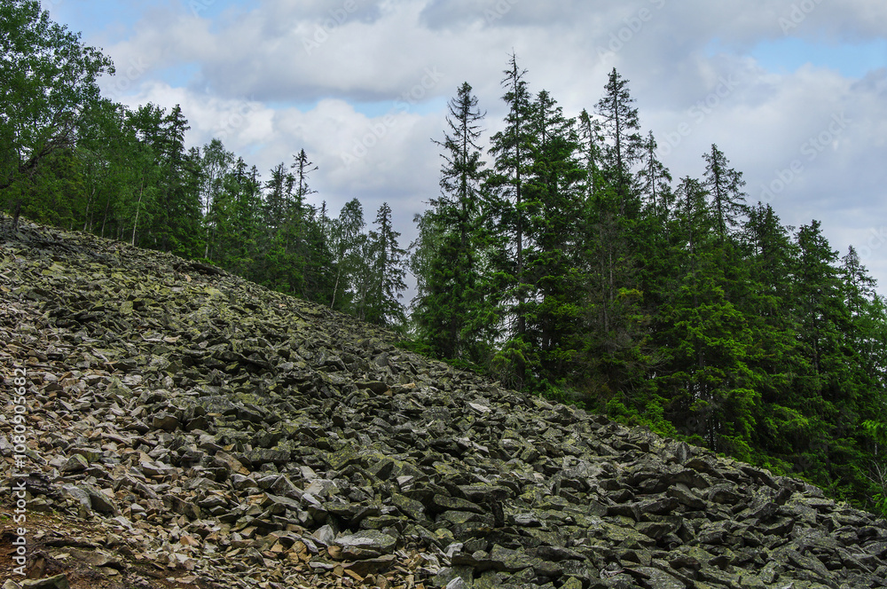 green stones on the slope, volcanic rocks. Climbing Mount Khomyak, Carpathian Mountains, Ukraine