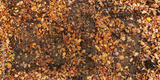 panoramic top view of grass texture with sluggish limp dry yellow and red autumn maple leaves