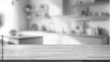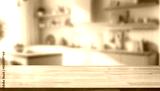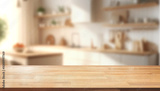 Empty wooden table front kitchen blurred background, orange tone morning or evening, warm mood. Modern minimal wood counter, decorated textured patterns, display food ,home decoration products.