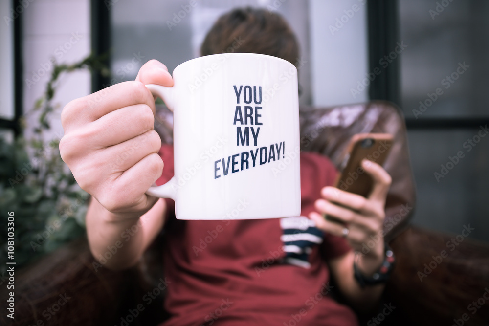 A guy hold coffee cup with word you are my everyday and playing smartphone. Love concept. Modern lifestyle.