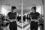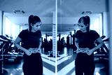 Athletic woman feeling dissatisfied with her body fat while looking herself in mirror at health club.
