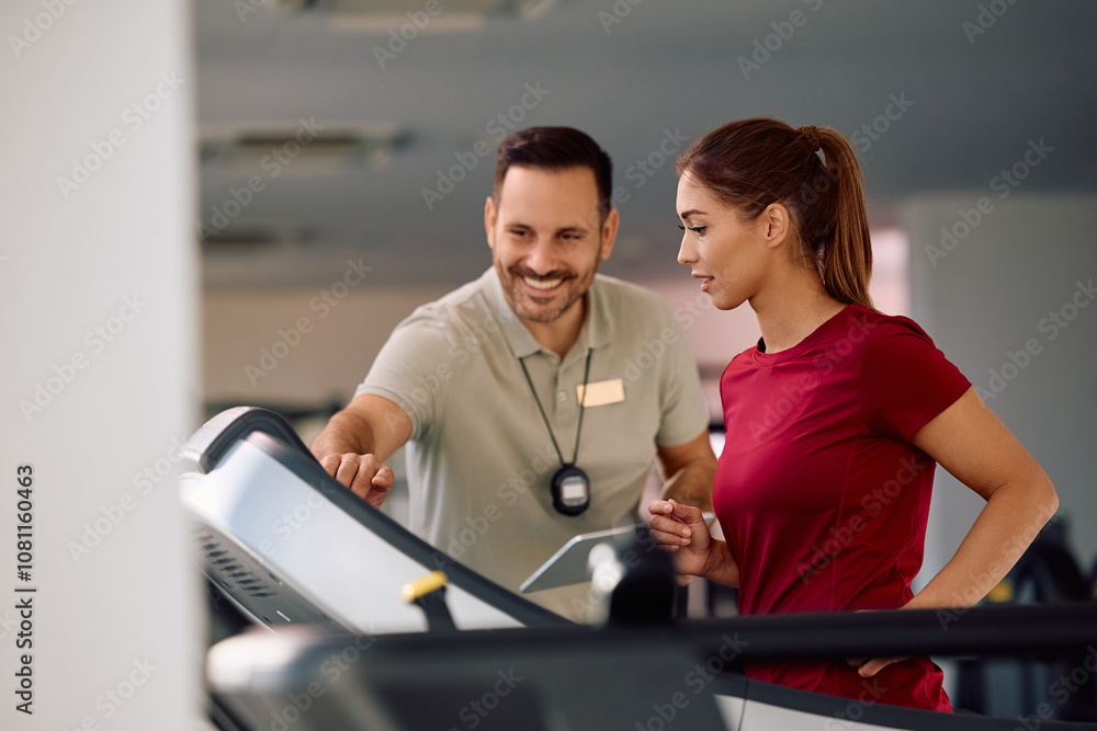 Personal coach adjusting speed on treadmill during exercise class with sportswoman in gym.