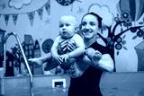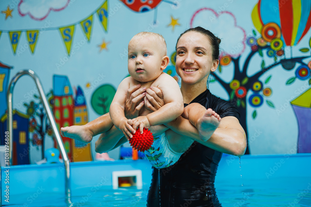 A coach teaches a baby boy to swim. Swimming pool for teaching children to swim.