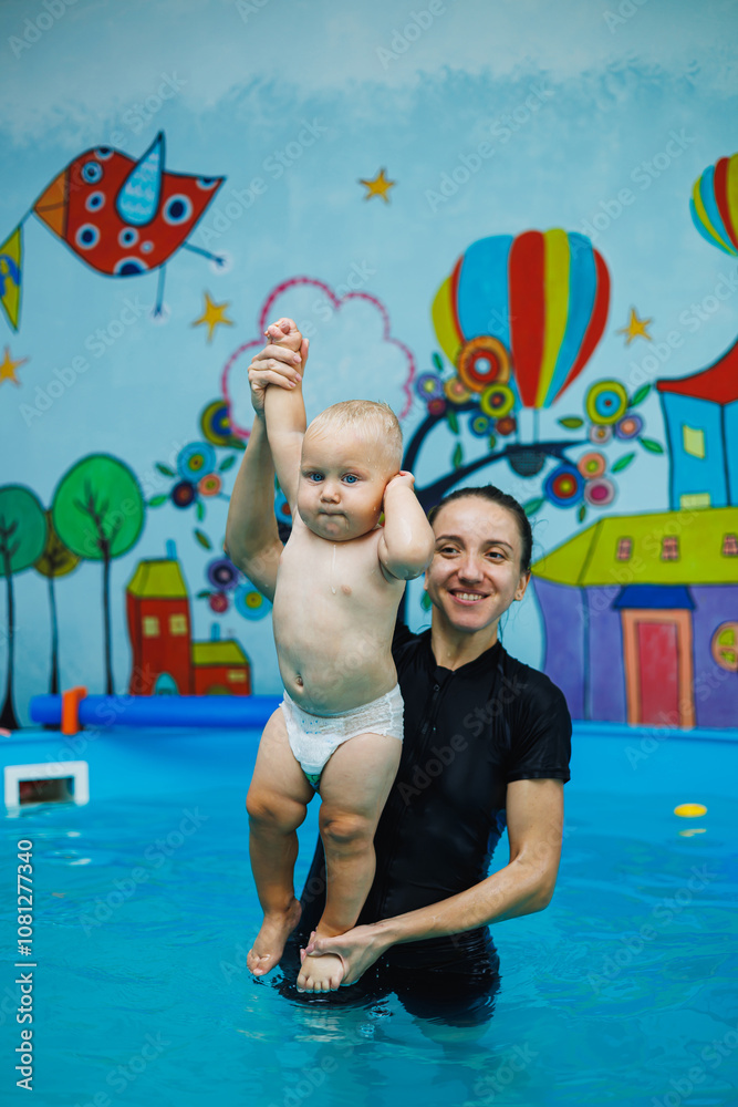 A coach teaches a baby boy to swim. Swimming pool for teaching children to swim.