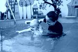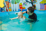 A child swims with his mother in a children's pool. A mother teaches her little son to swim.