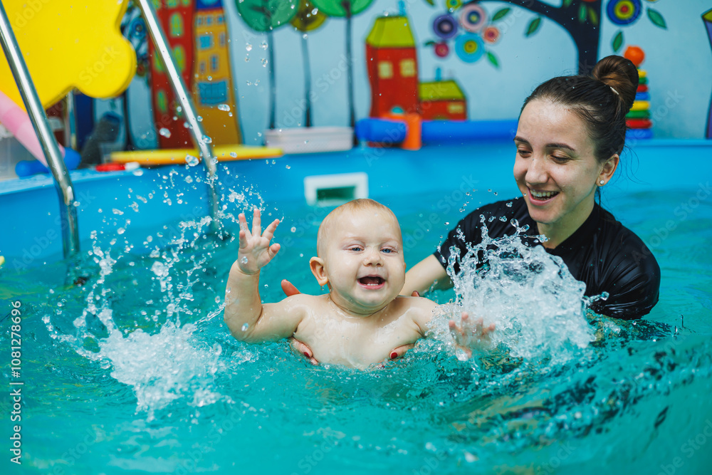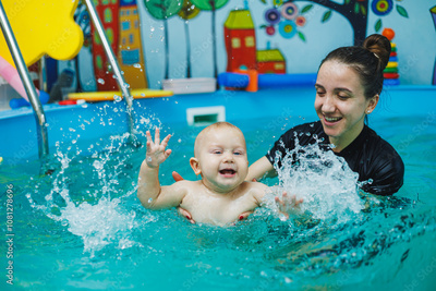 A child swims with his mother in a children's pool. A mother teaches her little son to swim.