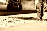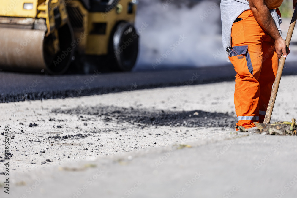 Construction worker using a shovel on a road while a steamroller paves asphalt on a sunny day during road repair operations