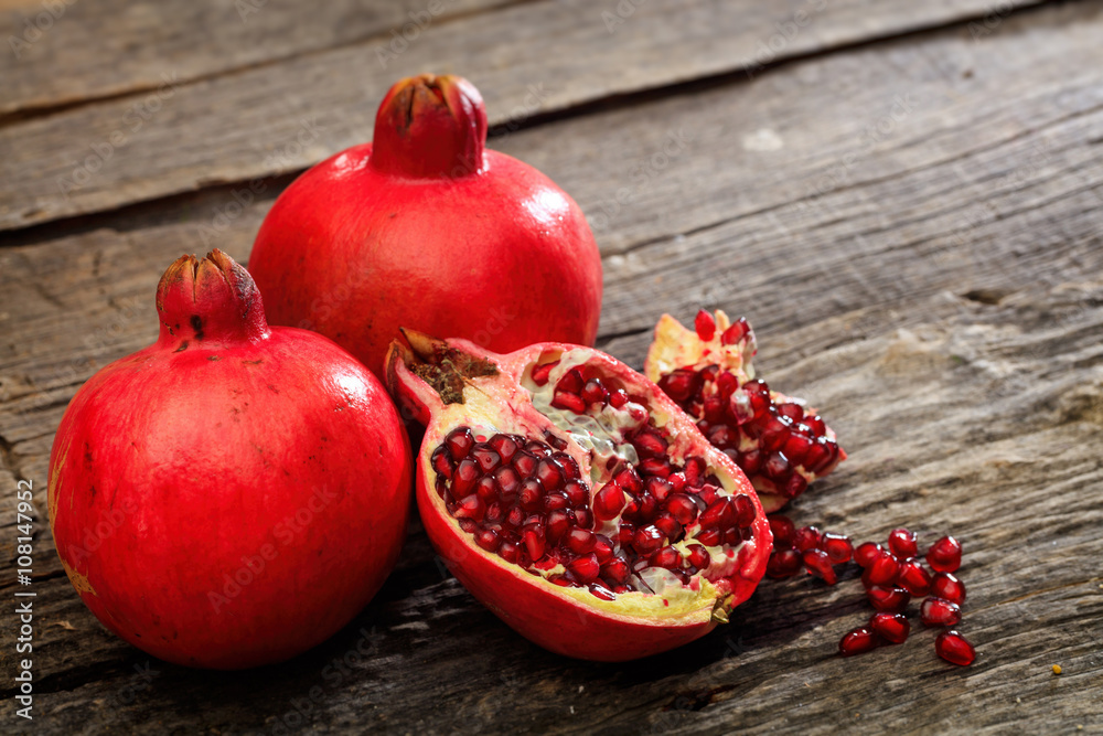 Two fresh red pomegranate fruits, with one peeled piece and seeds, set on old wooden surface