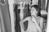 Home closet or store clothing rack changing room. Woman choosing her fashion outfit. Shopping girl thinking what to wear in front of many choices of dresses and clothes in organized clean walk-in.