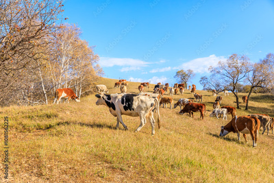 Cows grazing in meadow. Beautiful grassland pasture nature landscape in Inner Mongolia, China.