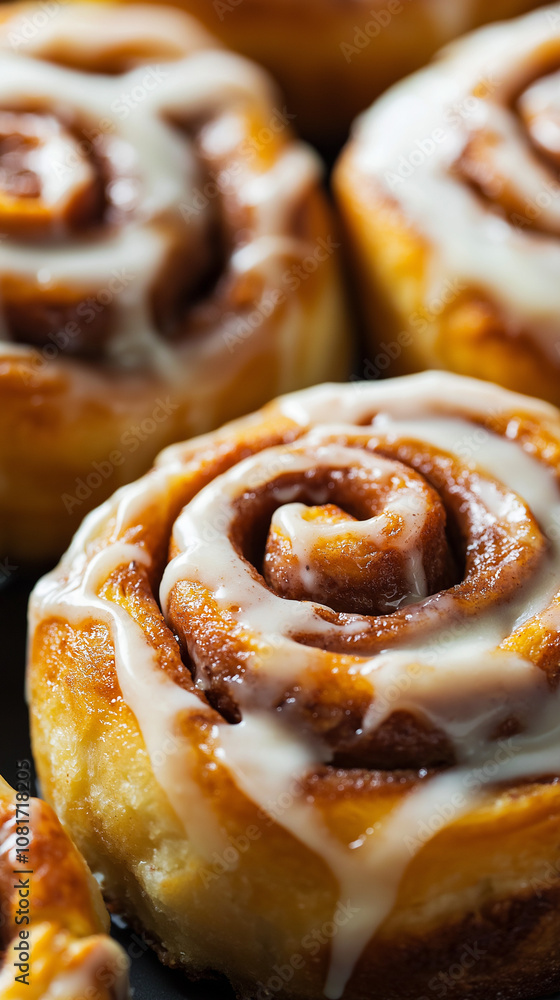 Close-up of freshly baked cinnamon rolls with icing, showcasing their gooey texture and golden brown color. Perfect for dessert, bakery, and comfort food themes.