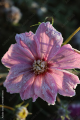 Pink Cosmos flowers covered by frost in the garden. Cosmos Bipinnatus on winter season