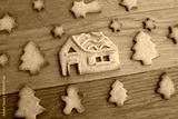 Christmas landscape with trees, house and stars made of gingerbread cookies on wooden table. Festive background