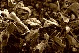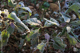 Eggplant plants covered by frost in the vegetable garden. Solanum melongena on early winter