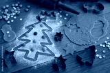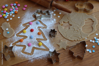 Gingerbread dough with cookie cutters and Christmas tree drawn on flour on wooden table