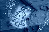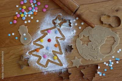 Gingerbread dough with cookie cutters and Christmas tree drawn on flour on wooden table