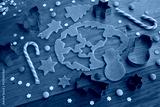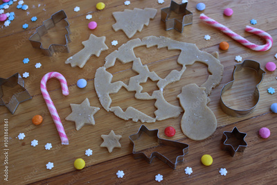 Gingerbread dough with cookie cutters and other Christmas decorations on wooden table