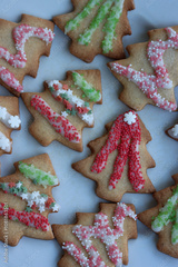 Christmas tree shaped gingerbread cookies on white. Festive winter background