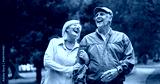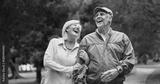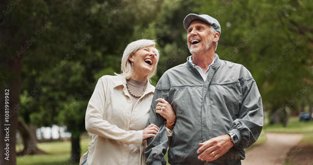 Smile, love and funny with old couple in park for retirement, happiness and wellness. Laughing, date and romance with senior man and woman bonding in nature for partner, marriage and comedy together