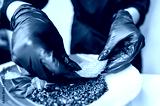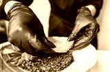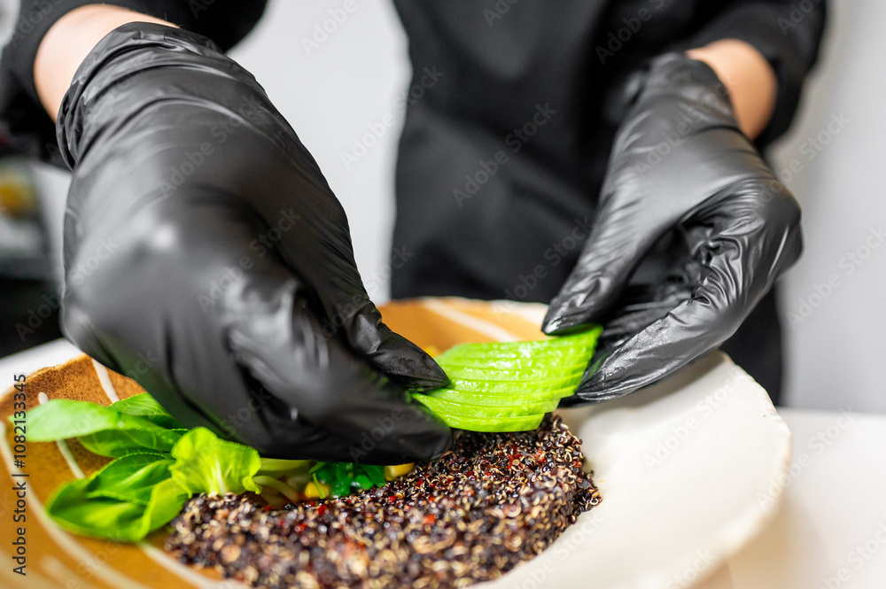 Close-up of hands in black gloves preparing a healthy meal, adding lettuce to a bowl with quinoa and basil leaves. Perfect for concepts of healthy eating, food preparation, and culinary arts.
