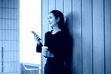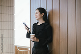 Happy and smiling Asian businesswoman with smartphone with success concept at work
