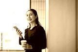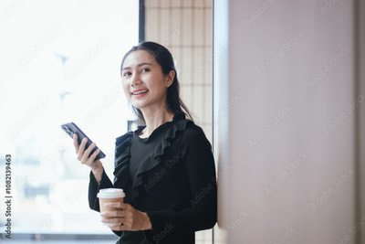 Happy and smiling Asian businesswoman with smartphone with success concept at work