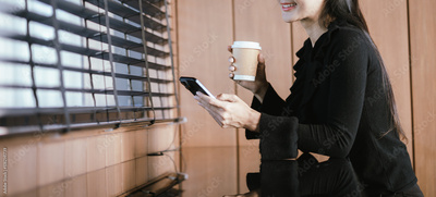 Beautiful Asian woman using smartphone and drinking hot coffee in cafe. Relaxation concept.
