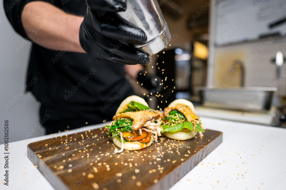 A close-up of a hand in a black glove sprinkling sesame seeds over two gourmet burgers on a wooden cutting board, with a blurred kitchen background. Perfect for food presentation and culinary themes.