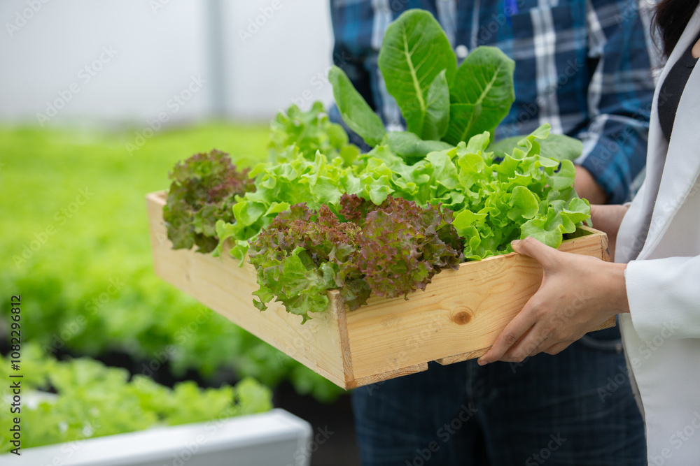Hydroponics fresh vegetables in wooden box. farmers holding wood basket with fresh vegetables in greenhouse farm. Business Agricultural Vegetable Production.
