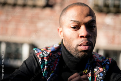 Fashion portrait of black man in city in modern spring or fall season outfit.