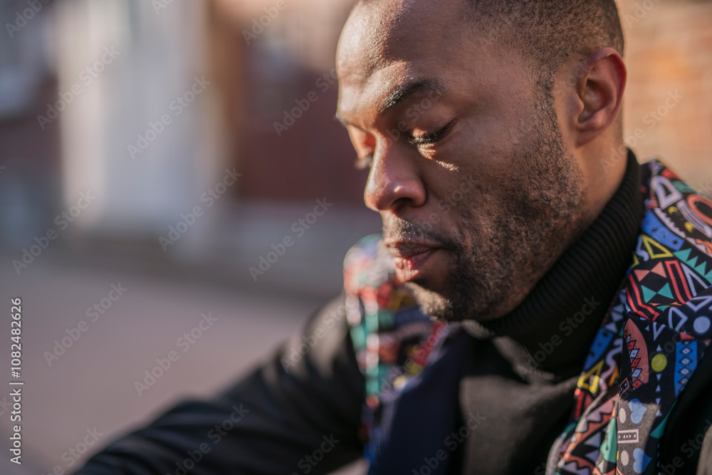 Fashion portrait of black man in city in modern spring or fall season outfit.