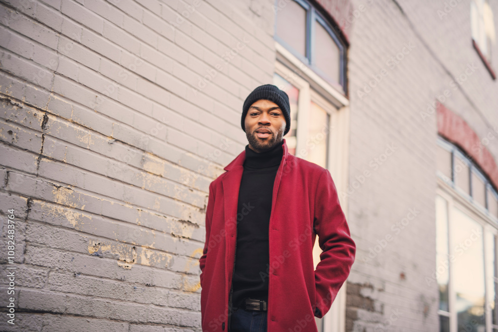 Fashion portrait of black man in city in modern spring or fall season outfit.