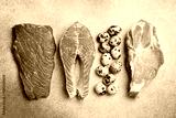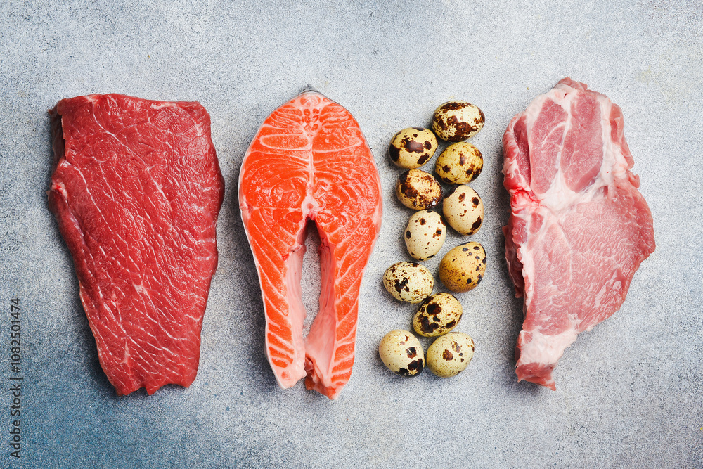 Products with a high protein content. Fish, beef, eggs, pork, chicken and seafood. Healthy food concept