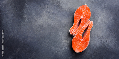 salmon, trout, steak, slice of fresh raw fish on a gray concrete background. Top view.