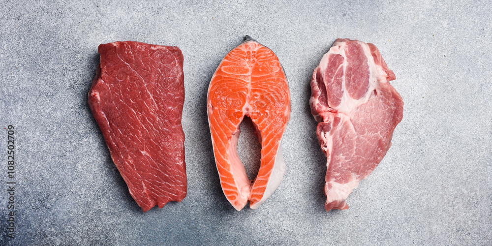 Set of raw beef, pork and salmon steaks. Free space for text. On a gray stone background.