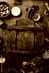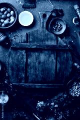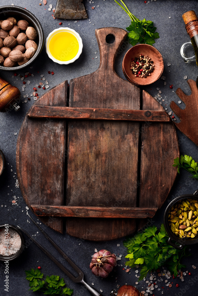 Black food background. Vegetables and spices on black background. Top view. Free space for your text.