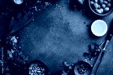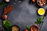 Black stone cooking background. Spices and vegetables. Top view. Free space for your text.