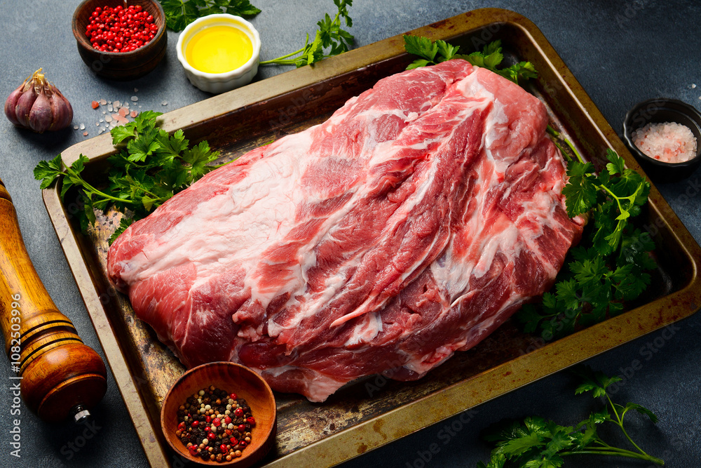 Raw meat: pork neck on a metal tray, ready to cook. Close up, meat texture.