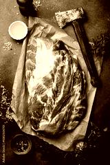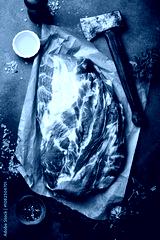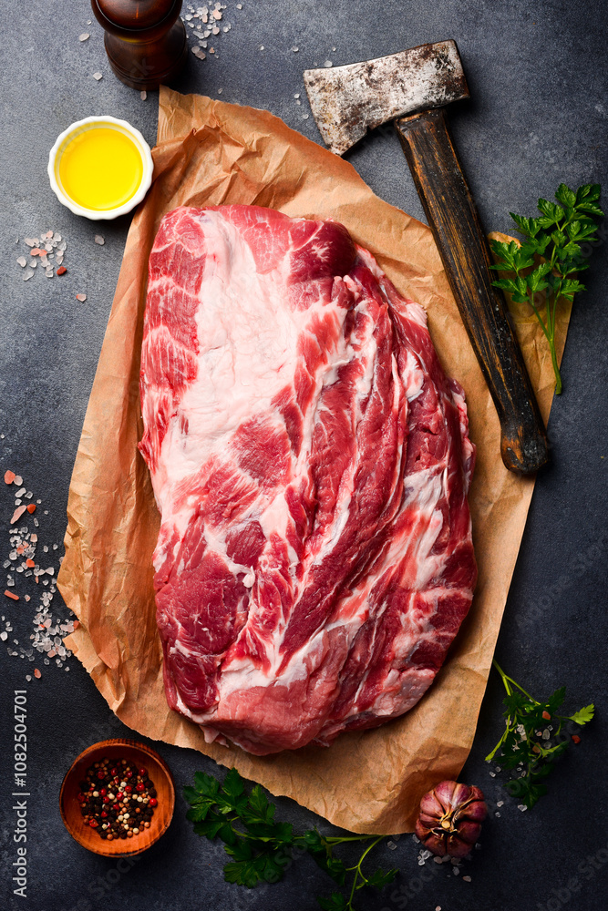 Piece of fresh raw pork from the neck, with ingredients and spices on a kitchen background. Meat. Top view. Rustic style.