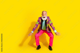 Full body photo of nice senior male dance knees dancing wear trendy colorful pink fancy outfit isolated on yellow color background