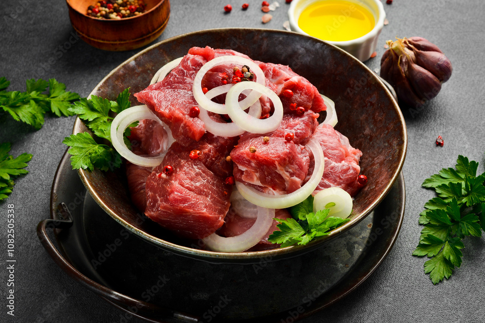 Raw pork neck cut into cubes in a bowl with onions and spices. Marinating kebab. On a gray stone background.