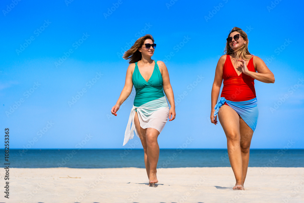 Two beautiful young females wearing one-piece bathing suits and pareo walking and talking on white sandy beach in summertime. Front view. Friendship.