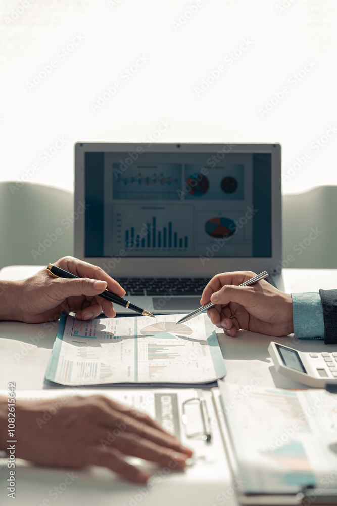 Team of data analysts with laptops and financial graph documents in hand With online reviews Meet the market research Statistics with collaboration, close-up, vertical
